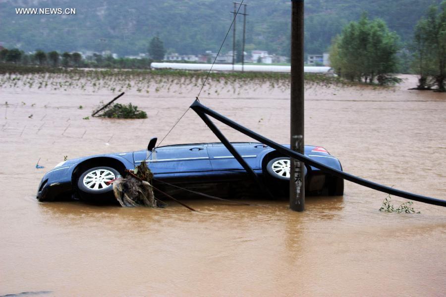Photo taken on Aug. 12, 2014 shows a car in flood waters in Houchang Township of Weining County, southwest China's Guizhou Province. The death toll from continuous rains in southwest China's Guizhou Province has increased to 12, with 12 still missing, local authorities said Tuesday. (Xinhua/Yue Gang)