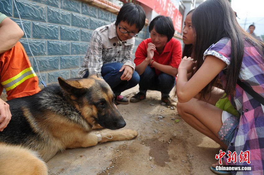 Many people in the quake-stricken area come to visit the sick rescue dog “Lang Zai”. (CNS/Liu Ranyang)