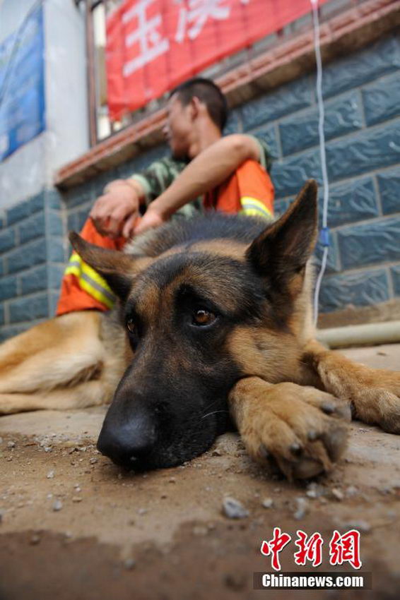 After the outbreak of Ludian earthquake, soldiers and rescue dogs from Yunnan fire department arrived at the epicenter Longtoushan town after an 8-hour journey and started search and rescue work at every disaster site. The soldiers and rescue dogs walked more than 50 kilometers every day, and the rescue dogs had to work excessively. Many people in the quake-stricken area came to visit the sick rescue dog “Lang Zai” (meaning wolf boy) on Aug. 9, 2014.