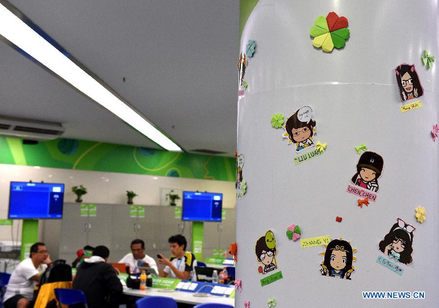 Volunteers of Nanjing 2014 Youth Olympic Games put up their cartoon photos on the wall of the Main Media Centre in Nanjing, capital of east China's Jiangsu province, on Aug. 13, 2014. (Xinhua/Yan Yan)