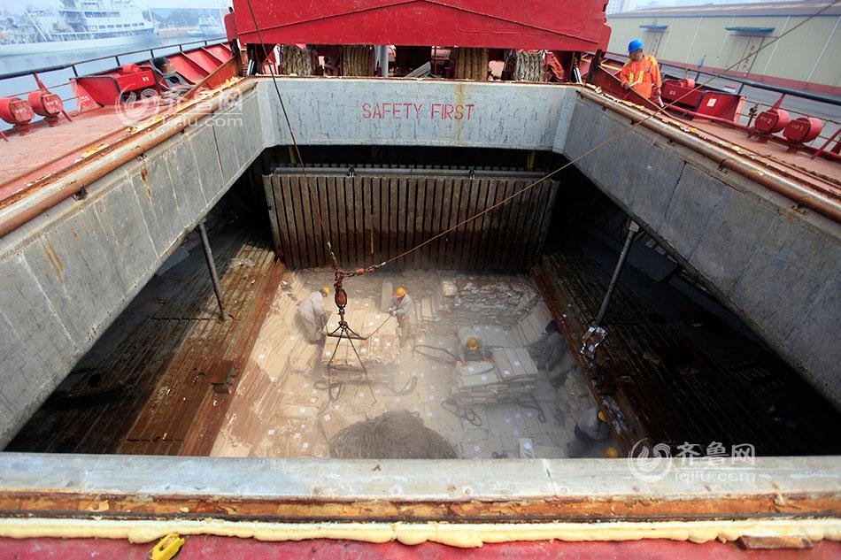 In a freezer from Russia, workers unload frozen fish. (Iqilu/Sun Zhiwen)
