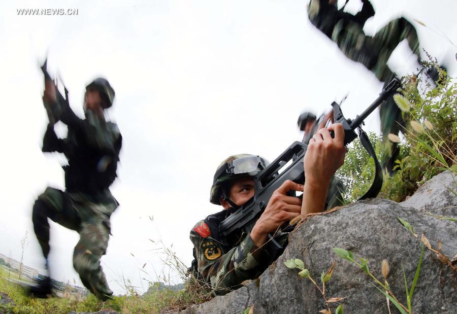 Armed policemen of Cobra Storm Troops take part in a drill in Guilin, south China's Guangxi Zhuang Autonomous Region, Aug. 14, 2014. (Xinhua/Liu Jiaoqing)