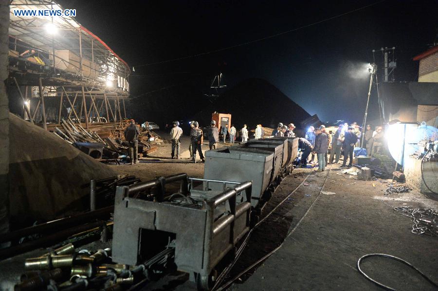 Photo taken on Aug. 15, 2014 shows the site where a well is flooded at the Anzhishun Coal Mine at the Chengzihe district of Jixi,in northeast China's Heilongjiang Province. Twenty-three people have been trapped after the coal mine was flooded in Jixi City on Aug. 14. (Xinhua/Wang Kai)