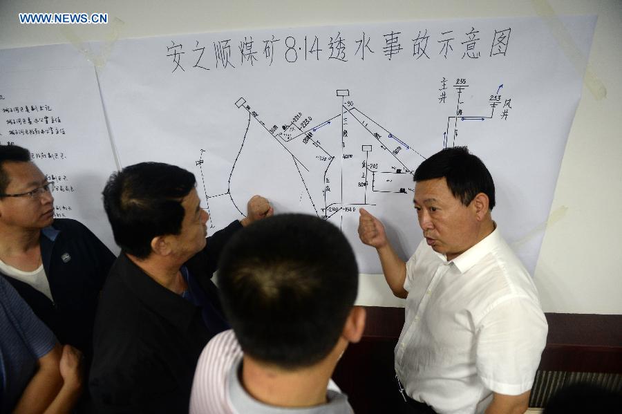 | People discuss rescue plan at the rescue headquarters after a well is flooded at the Anzhishun Coal Mine at the Chengzihe district of Jixi,in northeast China's Heilongjiang Province, early on Aug. 15, 2014. Twenty-three people have been trapped after the coal mine was flooded in Jixi City on Aug. 14. (Xinhua/Wang Kai) |