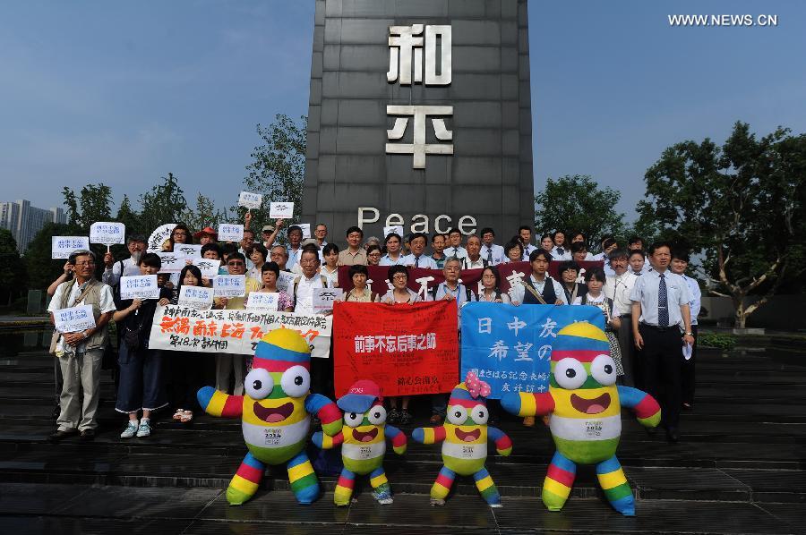 People pose for a group photo during an assembly to mourn for victims in the Nanjing Massacre at the Memorial Hall of the Victims in Nanjing Massacre by Japanese Invaders in Nanjing, capital of east China's Jiangsu Province, Aug. 15, 2014. Friday marked the 69th anniversary of Japan's unconditional surrender at the end of world War II. (Xinhua/Han Yuqing)