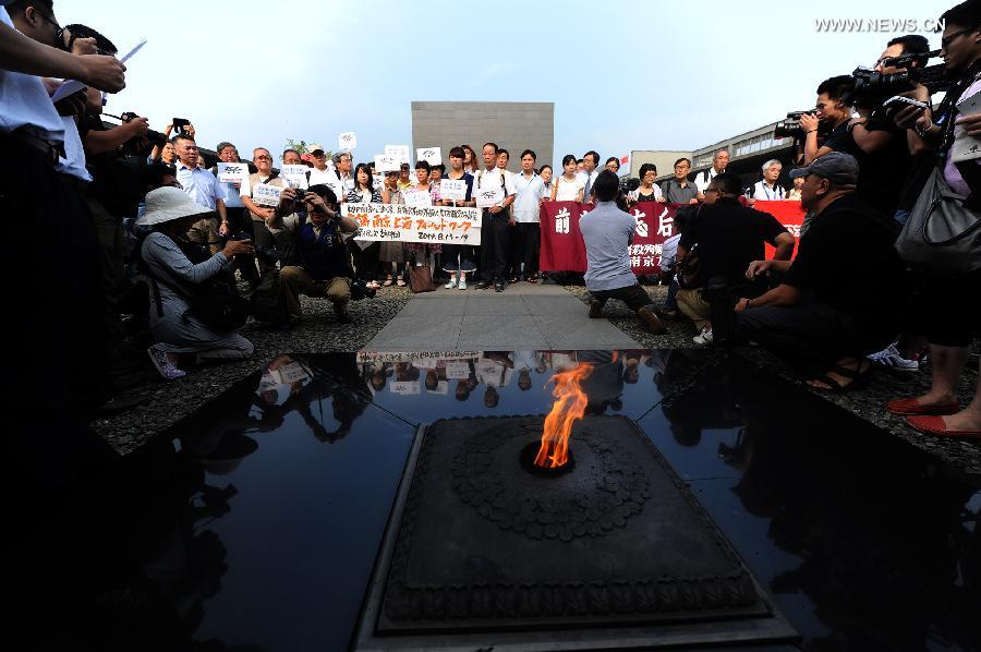 Japanese delegates attend an assembly to mourn for victims in the Nanjing Massacre at the Memorial Hall of the Victims in Nanjing Massacre by Japanese Invaders in Nanjing, capital of east China's Jiangsu Province, Aug. 15, 2014. Friday marked the 69th anniversary of Japan's unconditional surrender at the end of world War II. (Xinhua/Han Yuqing)