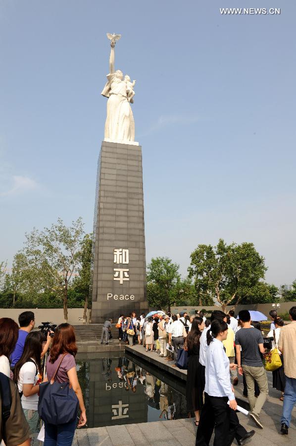 | People attend an assembly to mourn for victims in the Nanjing Massacre at the Memorial Hall of the Victims in Nanjing Massacre by Japanese Invaders in Nanjing, capital of east China's Jiangsu Province, Aug. 15, 2014. Friday marked the 69th anniversary of Japan's unconditional surrender at the end of world War II. (Xinhua/Sun Can) |