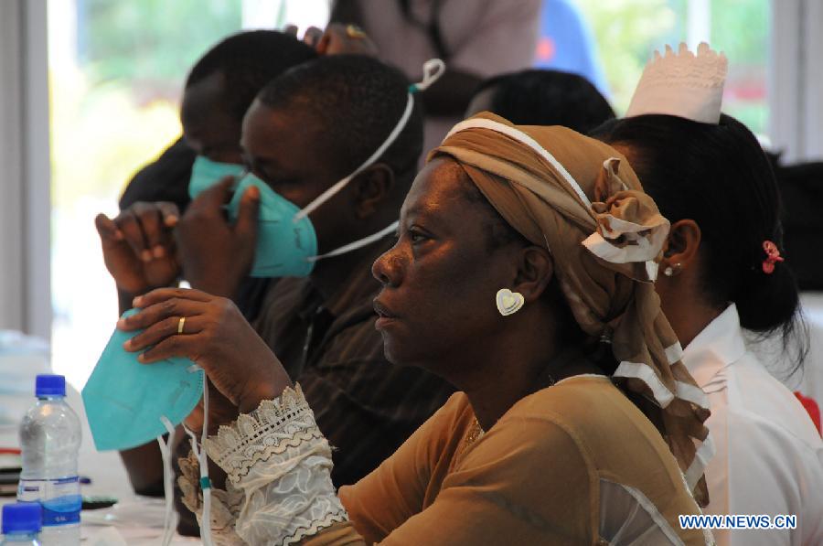 Sierra Leone medical workers participate in a training with members of Chinese medical expert team in Freetown, Sierra Leone, Aug. 14, 2014. China has sent three expert teams and medical supplies to Guinea, Liberia and Sierra Leone to assist in the prevention and control of the Ebola virus. (Xinhua/Lin Xiaowei)