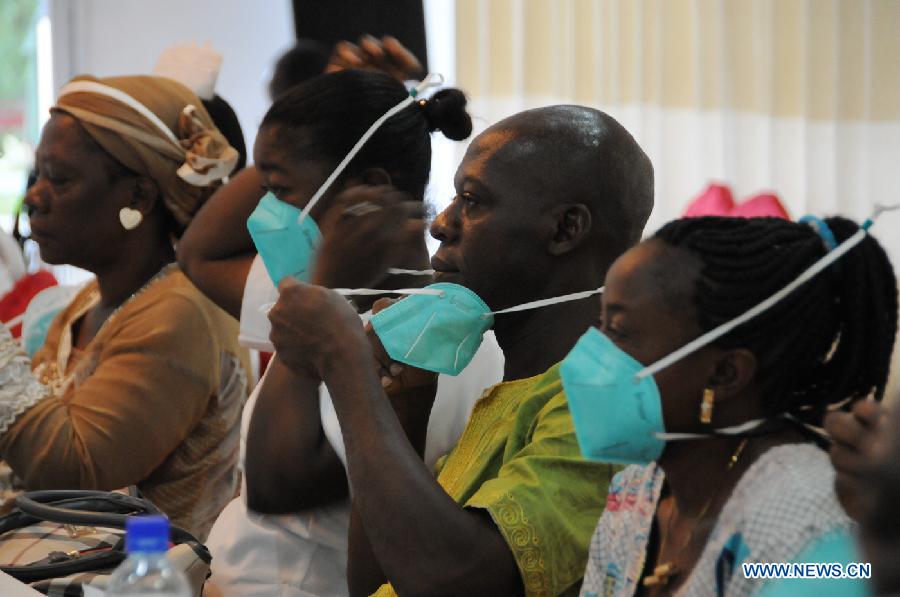 Sierra Leone medical workers participate in a training with members of Chinese medical expert team in Freetown, Sierra Leone, Aug. 14, 2014. China has sent three expert teams and medical supplies to Guinea, Liberia and Sierra Leone to assist in the prevention and control of the Ebola virus. (Xinhua/Lin Xiaowei)