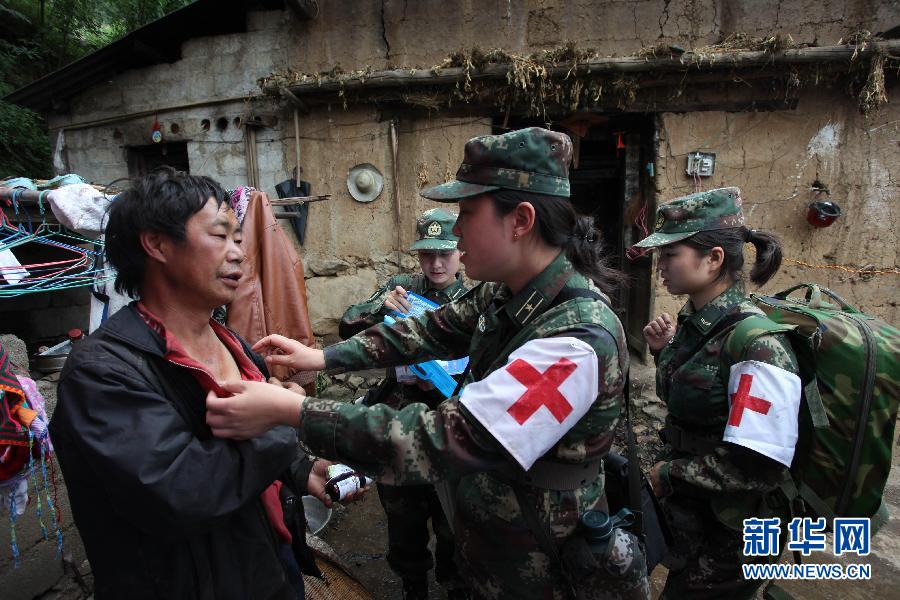 Female soldiers from a hospital of the Second Artillery Force treat villagers on Aug. 14, 2014. (Xinhua/Zhang Guangyu)
