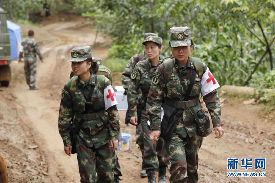 Female soldiers from a hospital of the Second Artillery Force walk into the hardest hit area on Aug. 14, 2014. (Xinhua/Zhang Guangyu)