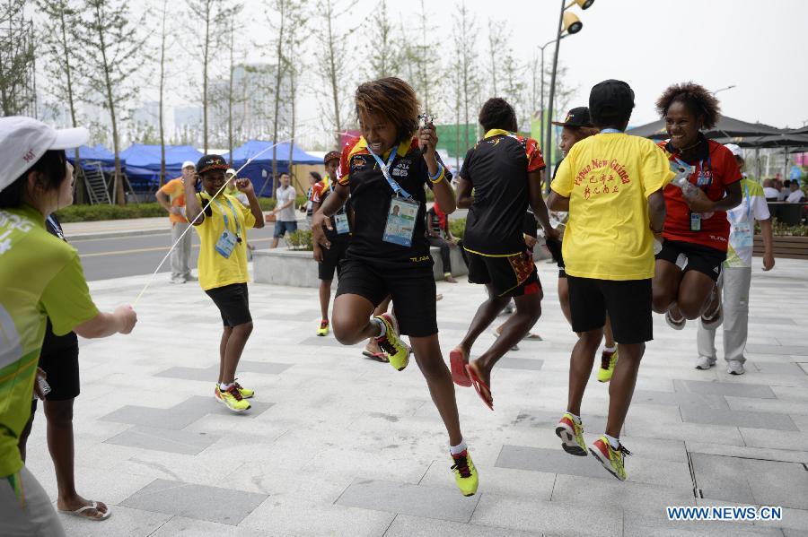 Faithy Kasiray (F) and her teammates of Papua New Guinea kick a shuttlecock in the Youth Olympic Village of Nanjing 2014 Olympic Games in Nanjing, capital of east China's Jiangsu Province, on Aug. 15, 2014. (Xinhua/Ju Huanzong)