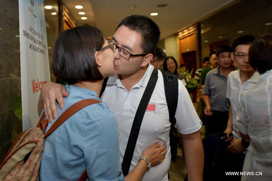 Yu Yang (R), a health worker of the Beijing Friendship Hospital, kisses his wife before departure at the Beijing Capital International Airport,Beijing, China, Aug. 15, 2014. The 24th Chinese medical team from the Beijing Friendship Hospital left for the Ebola-affected Guinea for a two-year aid mission on early Saturday. Besides, three public health experts from the disease prevention and control center, Ditan Hospital and Peking Union Medical College Hospital were also on the flight. (Xinhua/Li Xin)