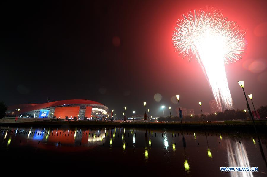 Fireworks explode during the opening ceremony for Nanjing 2014 Summer Youth Olympic Games in Nanjing, capital of east China's Jiangsu Province, Aug. 16, 2014. (Xinhua/Ju Huanzong)