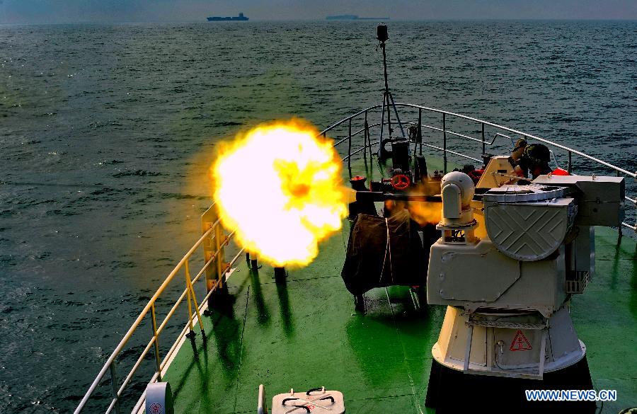 Soldiers of Fujian Coast Guard Forces attend an offshore drill at the Meizhou Bay, southeast China's Fujian Province, Aug. 16, 2014. (Xinhua/Zhang Guojun)
