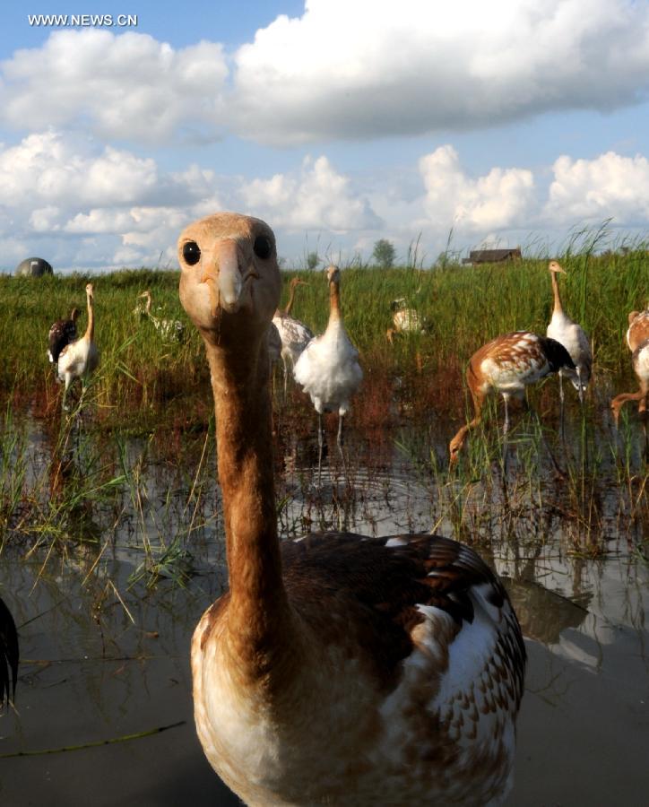 Young red-crowned cranes are seen at the Zhalong Natural Reserve in Qiqihar, northeast China's Heilongjiang Province, Aug. 17, 2014. (Xinhua/Wang Song)