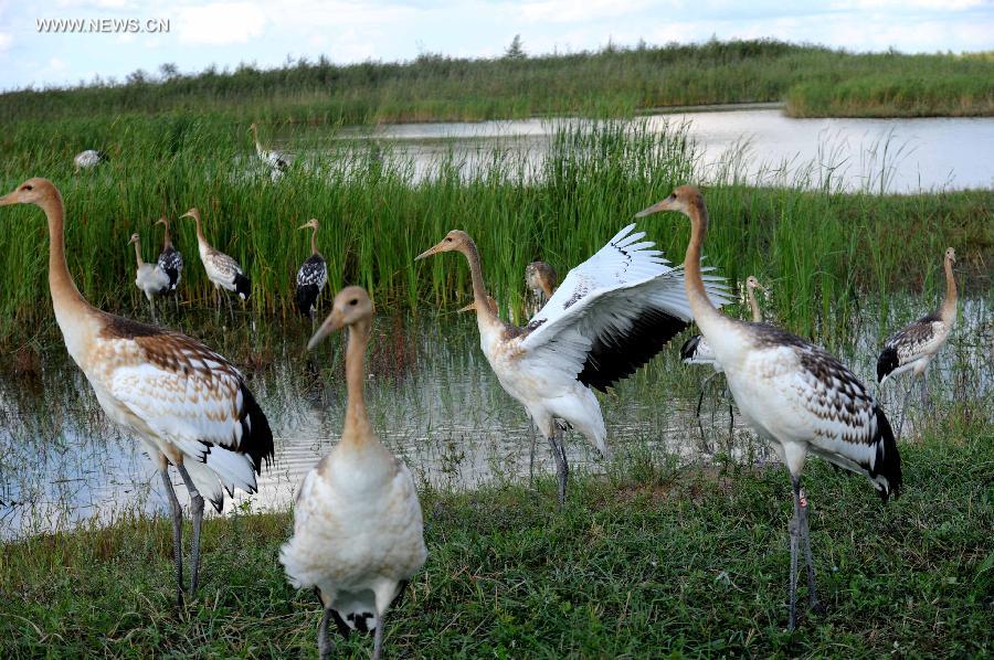 Young red-crowned cranes are seen at the Zhalong Natural Reserve in Qiqihar, northeast China's Heilongjiang Province, Aug. 17, 2014. (Xinhua/Wang Song)