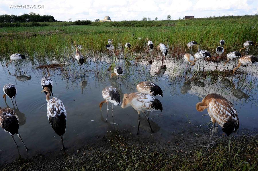 Young red-crowned cranes are seen at the Zhalong Natural Reserve in Qiqihar, northeast China's Heilongjiang Province, Aug. 17, 2014. (Xinhua/Wang Song)