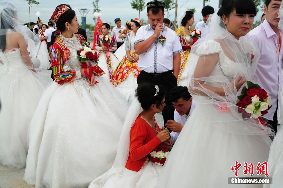 A group wedding is held for 60 couples in Yining, Kazak Autonomous Prefecture of Ili, Xinjiang Uyghur Autonomous Region on Aug. 18, 2014. The day marks the 60th anniversary of the founding of the prefecture. (Chinanews/Ma Xinlong)