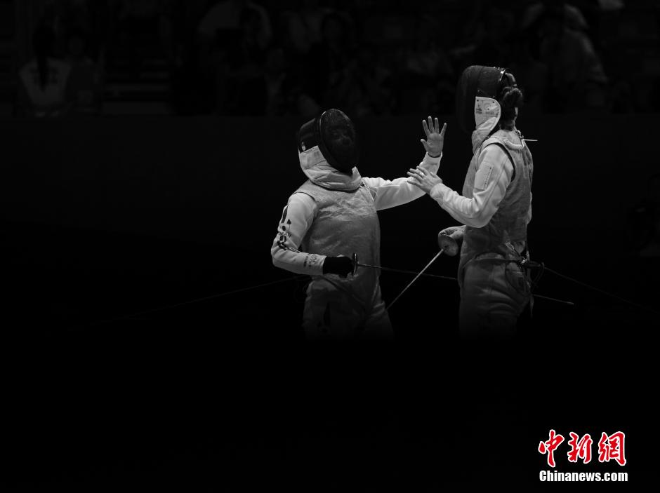 Sabrina Massialas (R) from the U.S. greets Karin Miyawaki (L) from Japan. Massialas beat Miyawaki at the Gold Medal Bout of Women's Foil Individual at YOG on Aug. 17, 2014. (CNS/Hou Yu)
