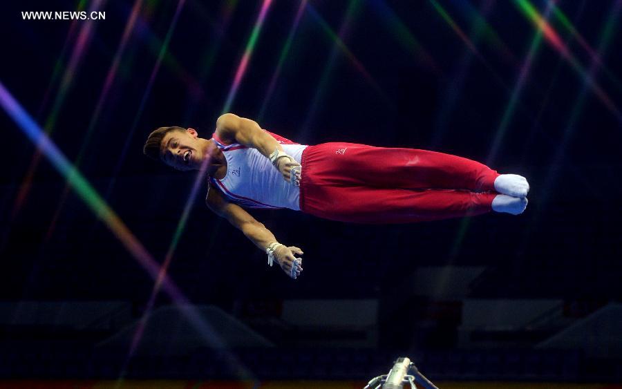 Gold medalist Giarnni Regini-Moran of Great Britain competes in the men's all-around final of artistic gymnastics at the 2nd Summer Youth Olympic Games (YOG) in Nanjing, capital of east China's Jiangsu Province, August 19, 2014. (Xinhua/Cheng Min)