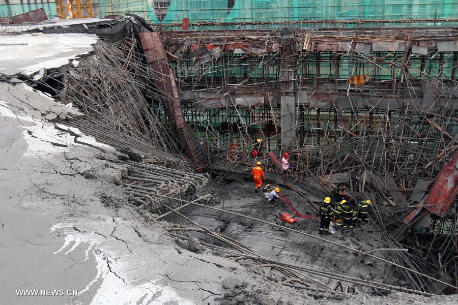 Rescuers work at the accident site after a building collapsed in Xiamen City, southeast China's Fujian Province, Aug. 20, 2014. The top floor of a shopping mall under construction partially collapsed early Wednesday, and all the three trapped workers have been rescued. (Xinhua/Zeng Demeng)
