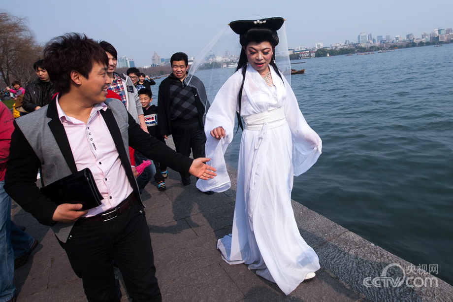 A cross-dressing man in White Snake costume walks along the West Lake in Hangzhou on Feb. 21, 2014. Legend of the White Snake is one of the most famous tales spreading out among folks in ancient China. (Photo/CNTV)