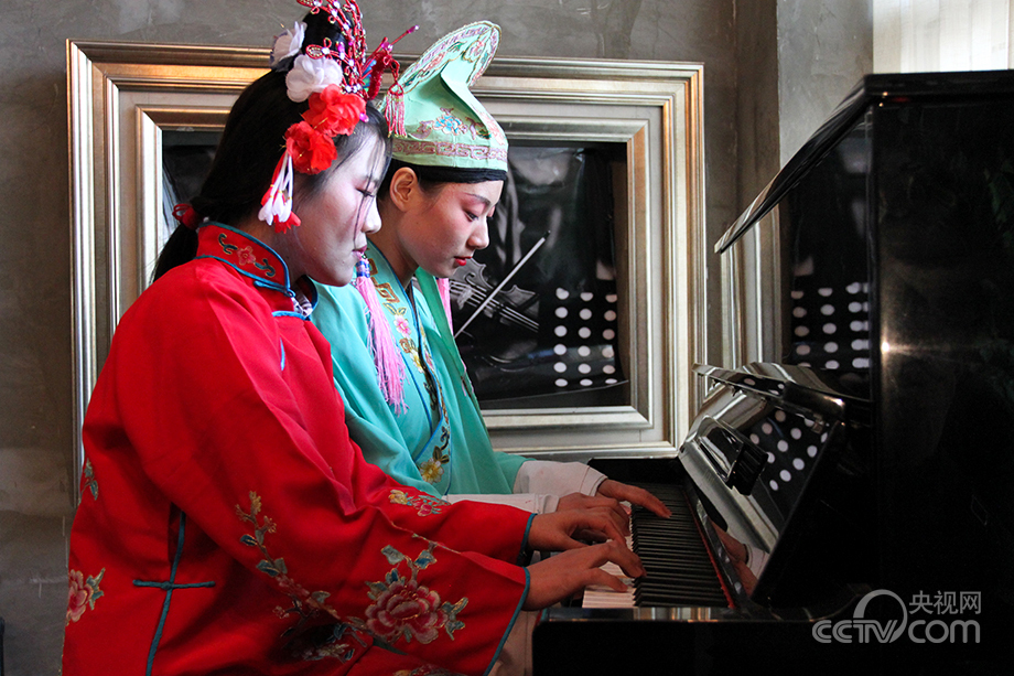 A man and a woman in costume play piano and drink coffee in a café in Linyi city of east China’s Shandong province on Dec. 8, 2012. (Photo/CNTV)