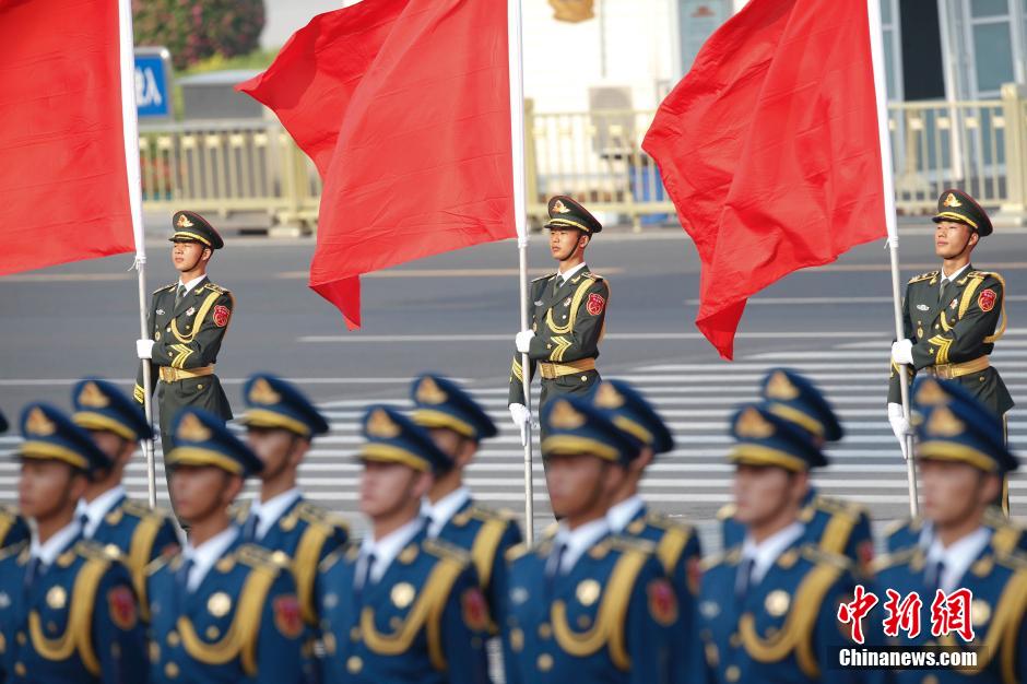 The Guard of Honor of the People's Liberation Army wearing the new type of uniform is reviewed at the welcome ceremony on Aug. 19, 2014. (CNS/Du Yang)