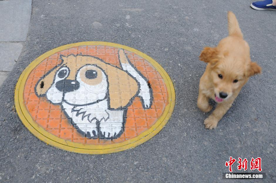 More than 30 graffiti are painted on manhole covers in a neighborhood in Shanxi on Aug. 18, 2014. The graffiti are creative and feast the public eyes. (CNS/Wu Junjie)