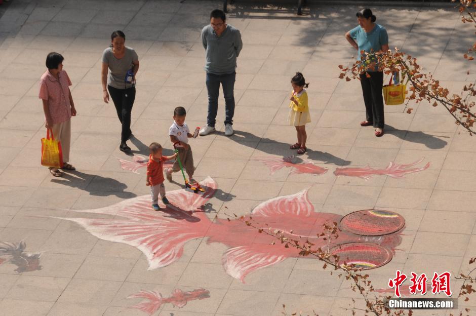 More than 30 graffiti are painted on manhole covers in a neighborhood in Shanxi on Aug. 18, 2014. The graffiti are creative and feast the public eyes. (CNS/Wu Junjie)