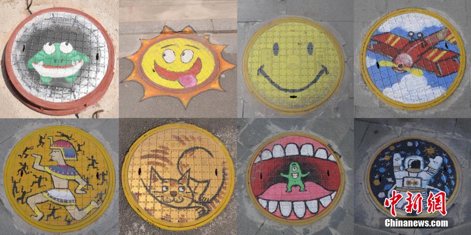 | More than 30 graffiti are painted on manhole covers in a neighborhood in Shanxi on Aug. 18, 2014. The graffiti are creative and feast the public eyes. (CNS/Wu Junjie) |
