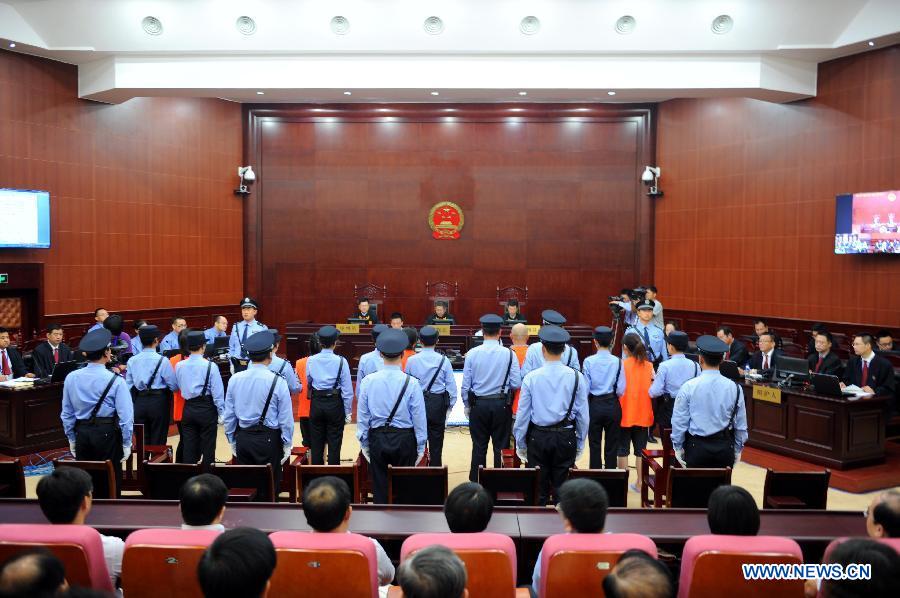 Five cult members Zhang Fan, Zhang Lidong, Lyu Yingchun, Zhang Hang and Zhang Qiaolian stand trial on murder charges in Yantai Intermediate People's Court in Yantai City, east China's Shandong Province, Aug. 21, 2014. A woman surnamed Wu was beaten to death on May 28 at a McDonald's outlet in Zhaoyuan City, Yantai, after she refused to give her telephone number to the suspects, who were allegedly trying to recruit new members for their cult Quannengshen, which means "almighty god." (Xinhua)