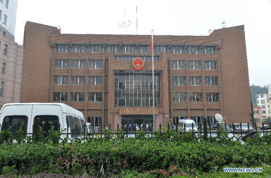 Photo taken on Aug. 21, 2014 shows the outdoor scene of Yantai Intermediate People's Court in Yantai City, east China's Shandong Province. Five cult members Zhang Fan, Zhang Lidong, Lyu Yingchun, Zhang Hang and Zhang Qiaolian stand trial Thursday morning on murder charges in the court. A woman surnamed Wu was beaten to death on May 28 at a McDonald's outlet in Zhaoyuan City, Yantai, after she refused to give her telephone number to the suspects, who were allegedly trying to recruit new members for their cult Quannengshen, which means "almighty god." (Xinhua/Zhu Zheng)