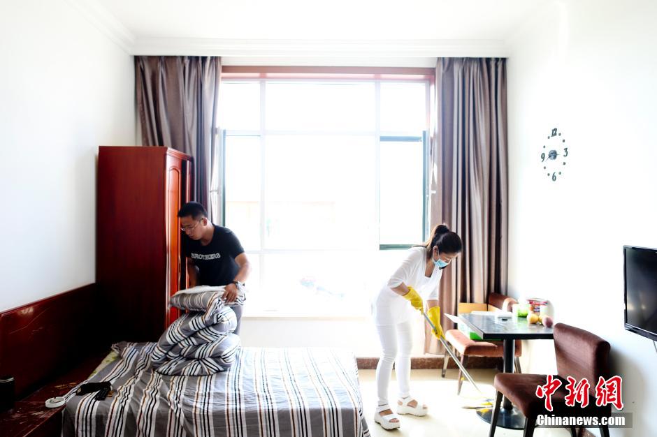 Tang Yixiang helps to clean the room. (CNS/Lu Xin)