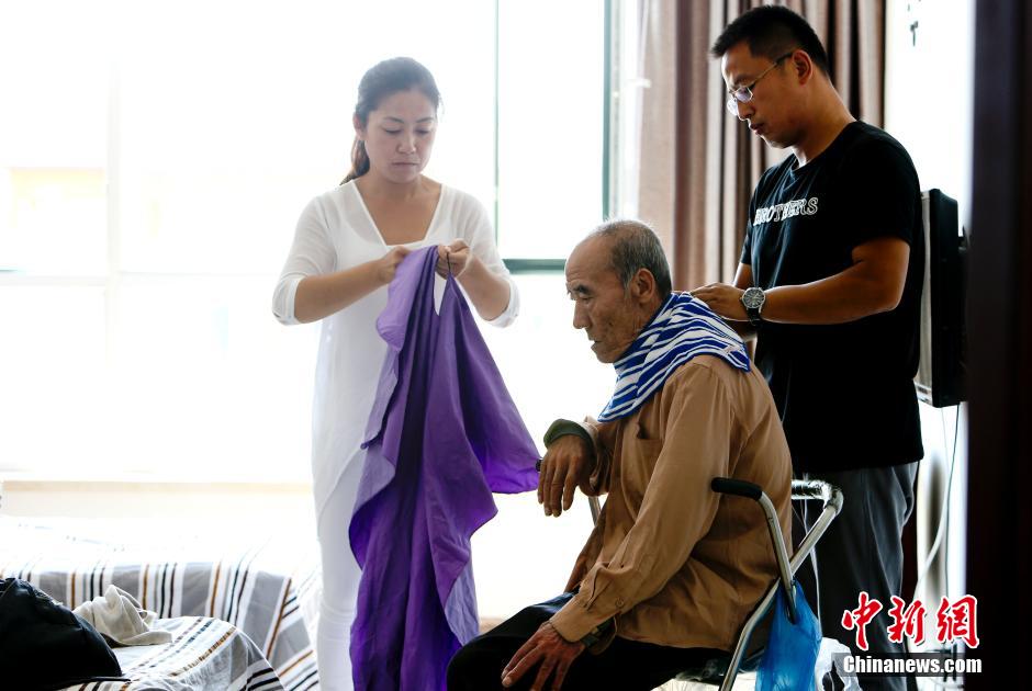Tang Yixiang prepares to cut hairs for the senior. (CNS/Lu Xin)