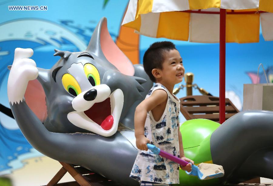 | A child plays before a model of Metro-Goldwyn-Mayer cartoon character Tom at a shopping mall in Shenyang, capital of northeast China's Liaoning Province, Aug. 22, 2014. (Xinhua/Yao Jianfeng) |