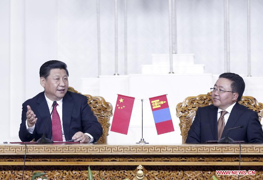 Chinese President Xi Jinping (L) and his Mongolian counterpart Tsakhiagiin Elbegdorj jointly meet with journalists after their talks in Ulan Bator, Mongolia, Aug. 21, 2014. Xi arrived in Ulan Bator Thursday for a two-day state visit to Mongolia. (Xinhua/Ju Peng)