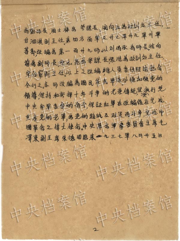 The Revolutionary Military Commission of the CPC Central Committee gave the order that the Red Army should be reorganized into the 8th Route Army, which was placed under the command of the National Revolutionary Army on August 25, 1937. (Photo/China's State Archives Administration)