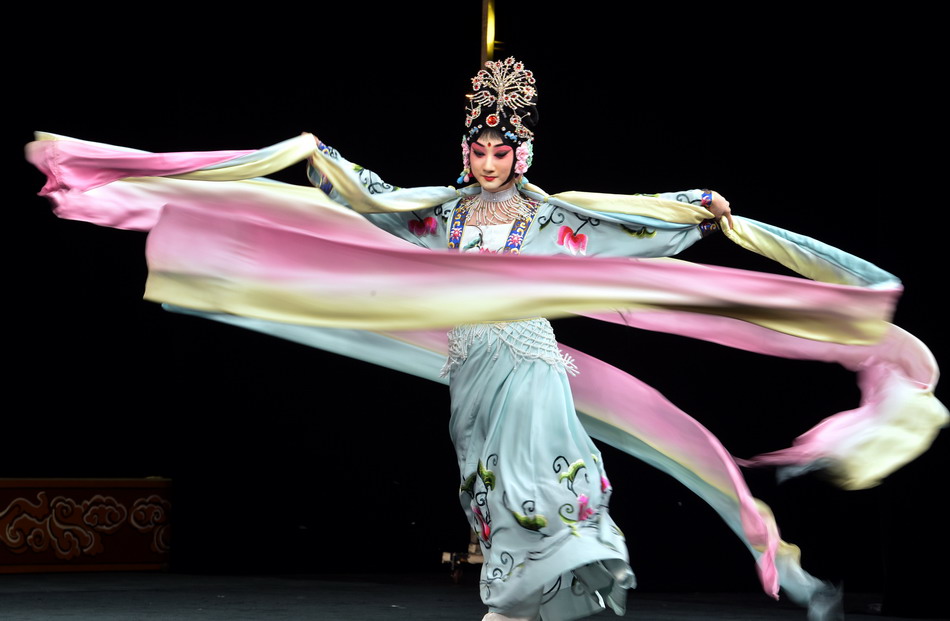 Actress Dou Xiaoxuan performs Beijing Opera "The Goddess Scatters Flowers" during a preview for media at Lincoln Center in New York City.(Xinhua/Wang Lei)