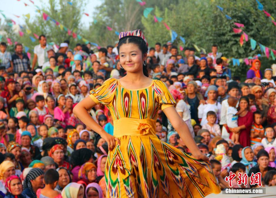 Farmers and herdsmen display ethnic costumes in Yaha town of Kuqa county, Xinjiang on Aug. 20, 2014. (Chinanews/Fan Hongying)