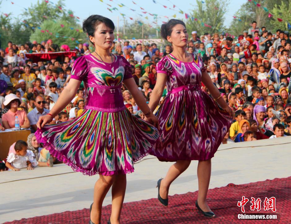 Farmers and herdsmen display ethnic costumes in Yaha town of Kuqa county, Xinjiang on Aug. 20, 2014. (Chinanews/Fan Hongying)