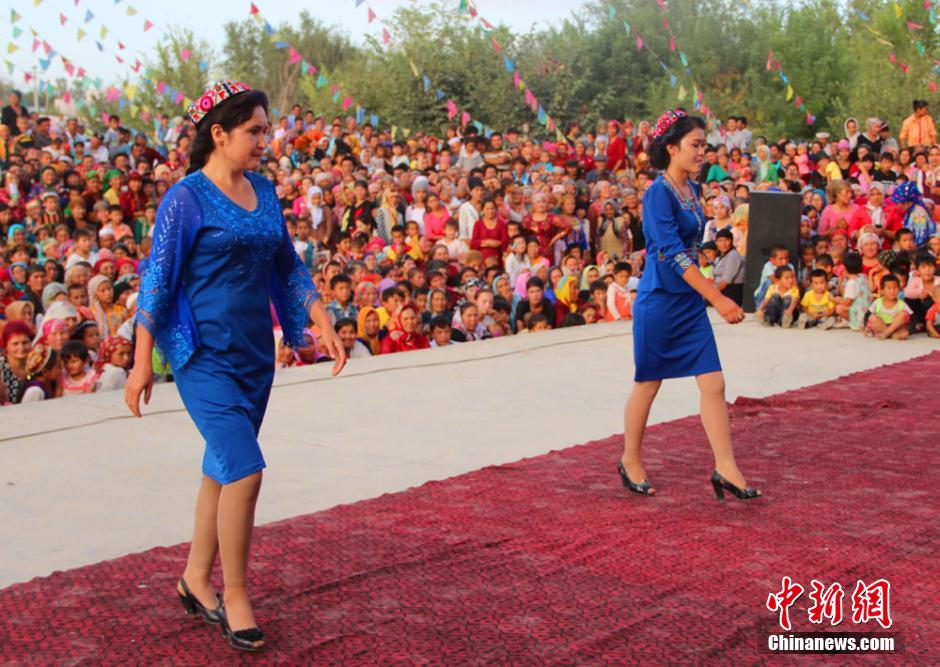 Farmers and herdsmen display ethnic costumes in Yaha town of Kuqa county, Xinjiang on Aug. 20, 2014. (Chinanews/Fan Hongying)