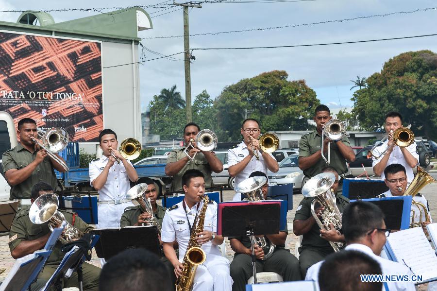 Members of the military band of the Peace Ark, hospital ship of China's People's Liberation Army Navy, perform with a Tongan military band in Nuku'alofa, Tonga, Aug. 15, 2014. The Peace Ark arrived in Fijian capital Suva on Friday, kicking off its week-long medical assistance mission in the South Pacific island country. With a full-load displacement of 14,220 tonnes, the Peack Ark, commissioned in 2008, is equipped with some 300 beds, eight operating rooms and over 200 types of medical devices including CT, color ultrasonic, automatic biochemistry analyzer, etc. (Xinhua/Qin Haishi)