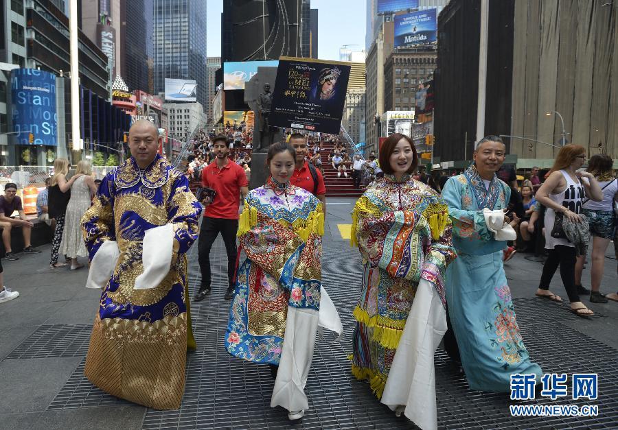 Peking opera actors and actresses, dressed in opera costumes, communicates with people on the street about Peking opera. (Xinhuanet/Wang Lei)