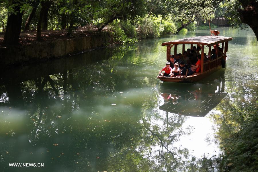 Tourists go sightseeing at the Ling Qu Canal in Xing'an county, southwest China's Guangxi Zhuang Autonomous Region, Aug. 23, 2014. Built in the Year 214 BC, the Ling Qu Canal is one of the oldest canals in the world which links the Xiangjiang River and Guijiang River to form a north south waterway of the region. (Xinhua/Wang Zichuang)