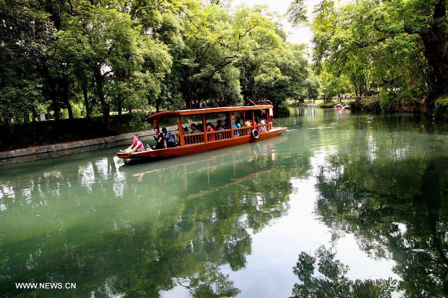 Tourists go sightseeing at the Ling Qu Canal in Xing'an county, southwest China's Guangxi Zhuang Autonomous Region, Aug. 23, 2014. Built in the Year 214 BC, the Ling Qu Canal is one of the oldest canals in the world which links the Xiangjiang River and Guijiang River to form a north south waterway of the region. (Xinhua/Wang Zichuang)