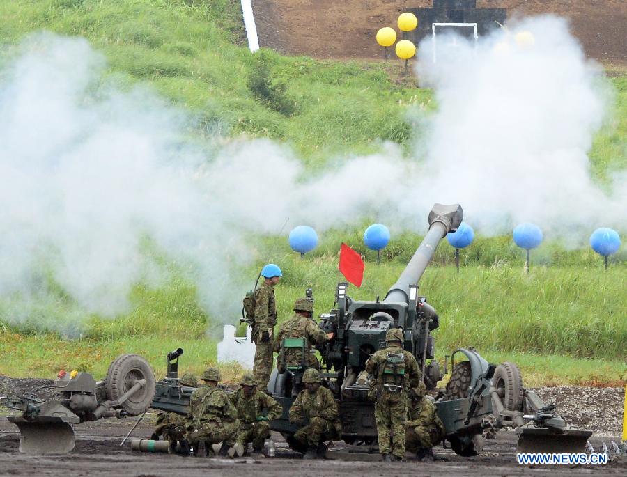 The Japanese Ground Self-Defense Forces (GSDF) attend live-fire drill at foothill of Mt. Fuji, Aug. 24, 2104. The Japanese GSDF on Sunday held an annual live-fire military drill in the GSDF maneuver field at the foothill of Mount Fuji in Gotemba city in Shizuoka Prefecture, with the participation of Defense Minister Itsunori Onodera. (Xinhua/Ma Ping)