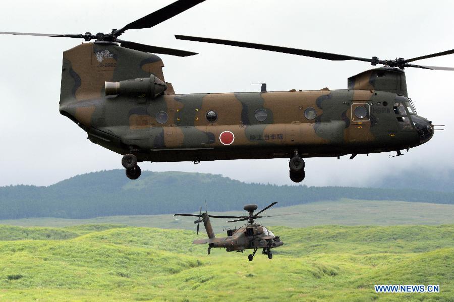 | The Japanese Ground Self-Defense Forces (GSDF) attend live-fire drill at foothill of Mt. Fuji, Aug. 24, 2104. The Japanese GSDF on Sunday held an annual live-fire military drill in the GSDF maneuver field at the foothill of Mount Fuji in Gotemba city in Shizuoka Prefecture, with the participation of Defense Minister Itsunori Onodera. (Xinhua/Ma Ping) |