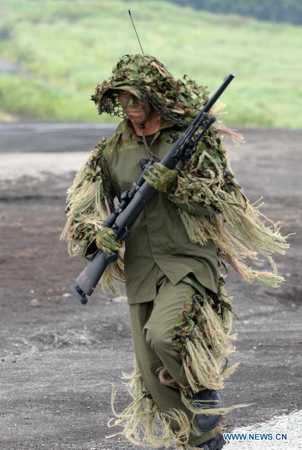 A Japanese Ground Self-Defense Forces (GSDF) soldier takes position during a live-fire drill at foothill of Mt. Fuji, Aug. 24, 2104. The Japanese GSDF on Sunday held an annual live-fire military drill in the GSDF maneuver field at the foothill of Mount Fuji in Gotemba city in Shizuoka Prefecture, with the participation of Defense Minister Itsunori Onodera. (Xinhua/Ma Ping)
